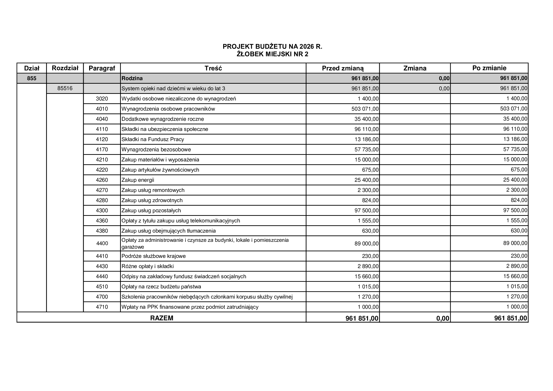 3020 Wydatki osobowe niezaliczone do wynagrodzeń 1 200,00 zł 4010 Wynagrodzenia osobowe pracowników 362 534,00 zł 4040 Dodatkowe wynagrodzenie roczne 13 380,00 zł 4110 Składki na ubezpieczenia społeczne 72 840,00 zł 4120 Składki na Fundusz Pracy 9 960,00 zł 4170 Wynagrodzenia bezosobowe 44 000,00 zł 4210 Zakup materiałów i wyposażenia 43 358,00 zł 4220 Zakup artykułów żywnościowych 42,00 zł 4260 Zakup energii 22 000,00 zł 4270 Zakup usług remontowych 2 000,00 zł 4280 Zakup usług zdrowotnych 1 500,00 zł 4300 Zakup usług pozostałych 90 953,00 zł 4360 Opłaty z tytułu zakupu usług telekomunikacyjnych 1 100,00 zł 4380 Zakup usług obejmujących tłumaczenia 440,00 zł 4400 Opłaty za administrowanie i czynsze za budynki, lokale i pomieszczenia garażowe 48 330,00 zł 4410 Podróże służbowe krajowe 200,00 zł 4430 Różne opłaty i składki 1 307,00 zł 4440 Odpisy na zakładowy fundusz świadczeń socjalnych 11 225,00 zł 4510 Opłaty na rzecz budżetu państwa 300,00 zł 4700 Szkolenia pracowników niebędących członkami korpusu służby cywilnej 1 100,00 zł 4710 Wpłaty na PPK finansowane przez podmiot zatrudniający 1 000,00 zł 728 769,00 zł |